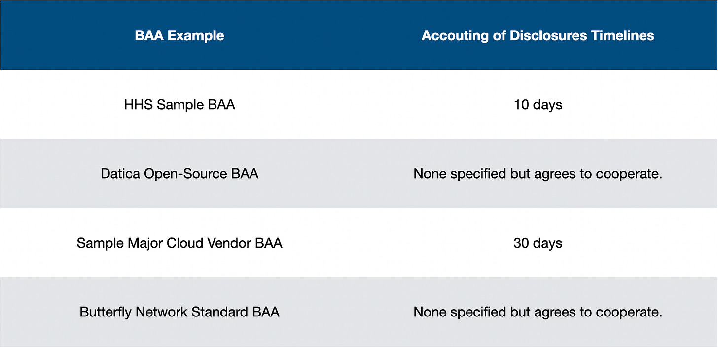 Account of Disclosures → Similarly to Access to PHI and Amendment of PHI, patients also have rights regarding understanding how a Covered Entity and their Business Associates disclosed their data. If a patient requests this, the Covered Entity will need to provide information about the disclosure and call upon their Business Associates and sub-contractors about their disclosures. The Covered Entity must respond to the patient’s request within 60 days (longer in the event of some exceptions) so generally speaking a Business Associate will be required to guarantee some timelines on providing information about disclosures. Comparing our BAAs again:
